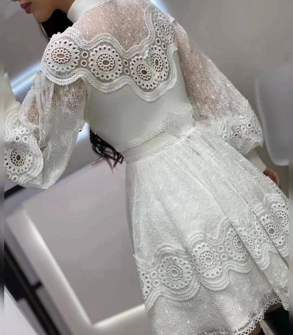 Rochie albă din dantelă brodată, cu o linie delicată și un design ce îmbină feminitatea cu eleganța clasică. Mânecele ample și detaliile atent lucrate oferă un efect romantic, iar croiala ușor evazată creează o mișcare fluidă și rafinată. Un model luminos și sofisticat, ideal pentru evenimente de zi, petreceri în aer liber sau momente în care eleganța naturală este cheia.