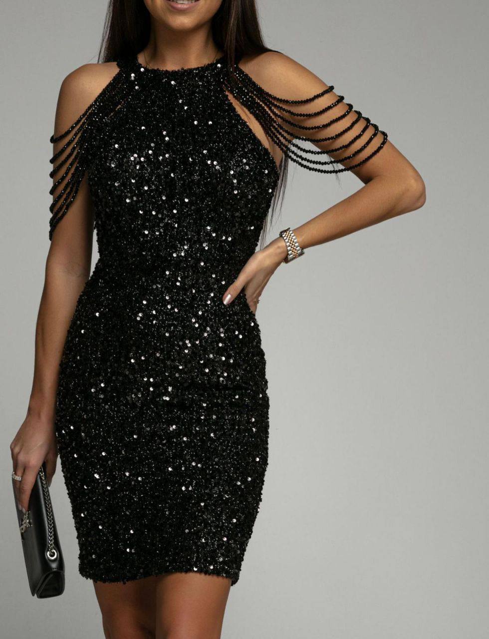 Rochie scurtă din paiete negre, concepută pentru un efect strălucitor la fiecare mișcare. Modelul cu umeri decupați este accentuat de șiraguri elegante de mărgele, care adaugă un detaliu glam și rafinat. Croiul mulat evidențiază silueta, iar lungimea mini oferă un look modern și seducător. Ideală pentru petreceri, evenimente speciale și seri în care vrei să ieși în evidență.